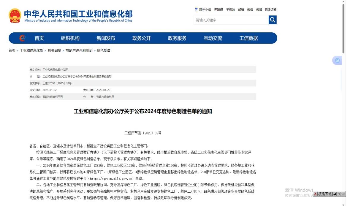 近日,工業和信息化部公布2024年度綠色制造名單,河北冀衡化學股份有限公司獲評國家級“綠色工廠”。